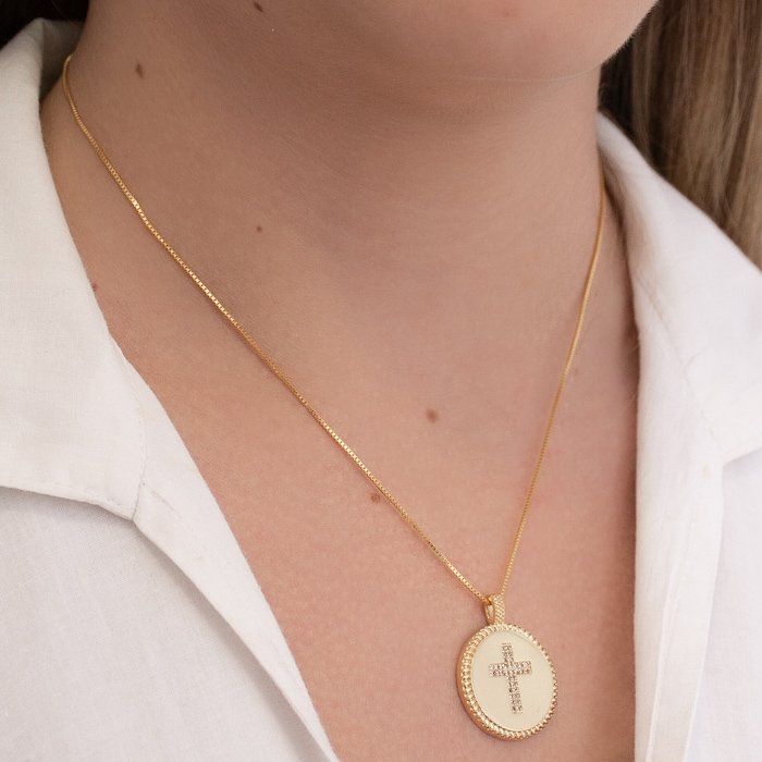Se você está em busca de uma peça que una elegância e significado, o Colar Medalha Cruz Cravejada na Veneziana em Ouro 18k é a escolha perfeita para você, mulher moderna e sofisticada que busca por joias que expressam sua personalidade única e refinada. Essa deslumbrante peça é a combinação ideal entre estilo atemporal e um toque contemporâneo, perfeito para mulheres que amam estar sempre na moda, com uma pitada de sofisticação clássica. A sofisticação do ouro 18k se une ao design delicado da medalha cravejada com zircônias, criando um colar que irradia elegância e brilho. ✨