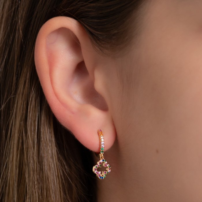 MINI ARGOLA ARTICULADA COM TREVO VAZADO CRAVEJADO COLORIDO – O Clássico Atemporal com Sofisticação e Brilho